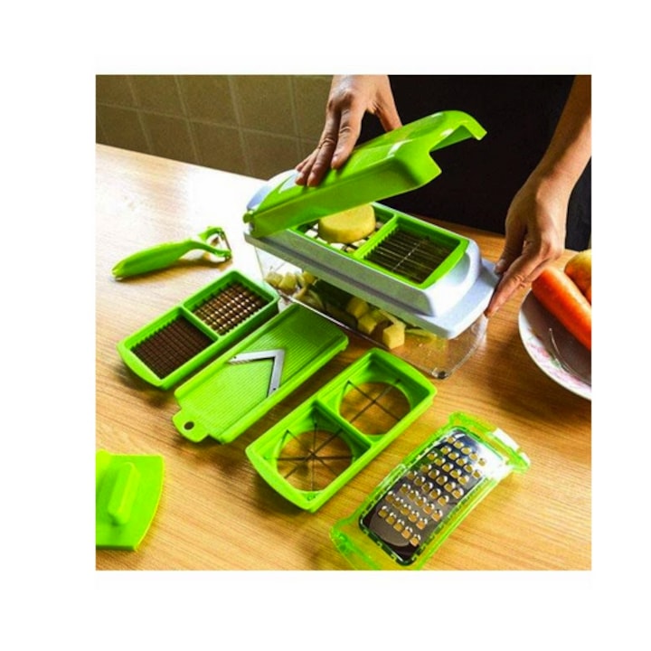 Designul elegant alb-verde îl face estetic plăcut, iar dimensiunile de 28,5 × 11,5 × 14 cm îl fac compact, dar eficient. Dispune de recipient integrat pentru colectare, pentru a păstra ordinea în bucătărie. Ideal pentru gătit rapid, salate, murături sau preparate pentru copii.